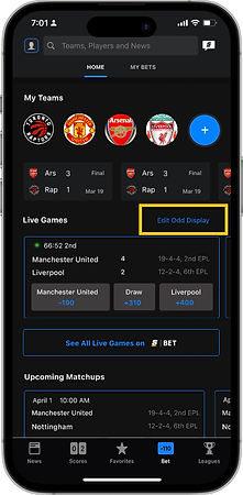 The solutions we came up with for this problem were straight forward which were a redesigned home section and giving the user an option to change the odds display to their liking within the bet feature which makes it tailored to the user and the feature uses the selection of favorite leagues and teams. This helps us achieve consistency through out the product and tailored contents avoids the overwhelming feeling which then leads to more interaction with the bet feature